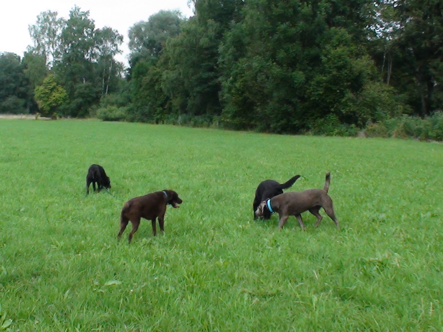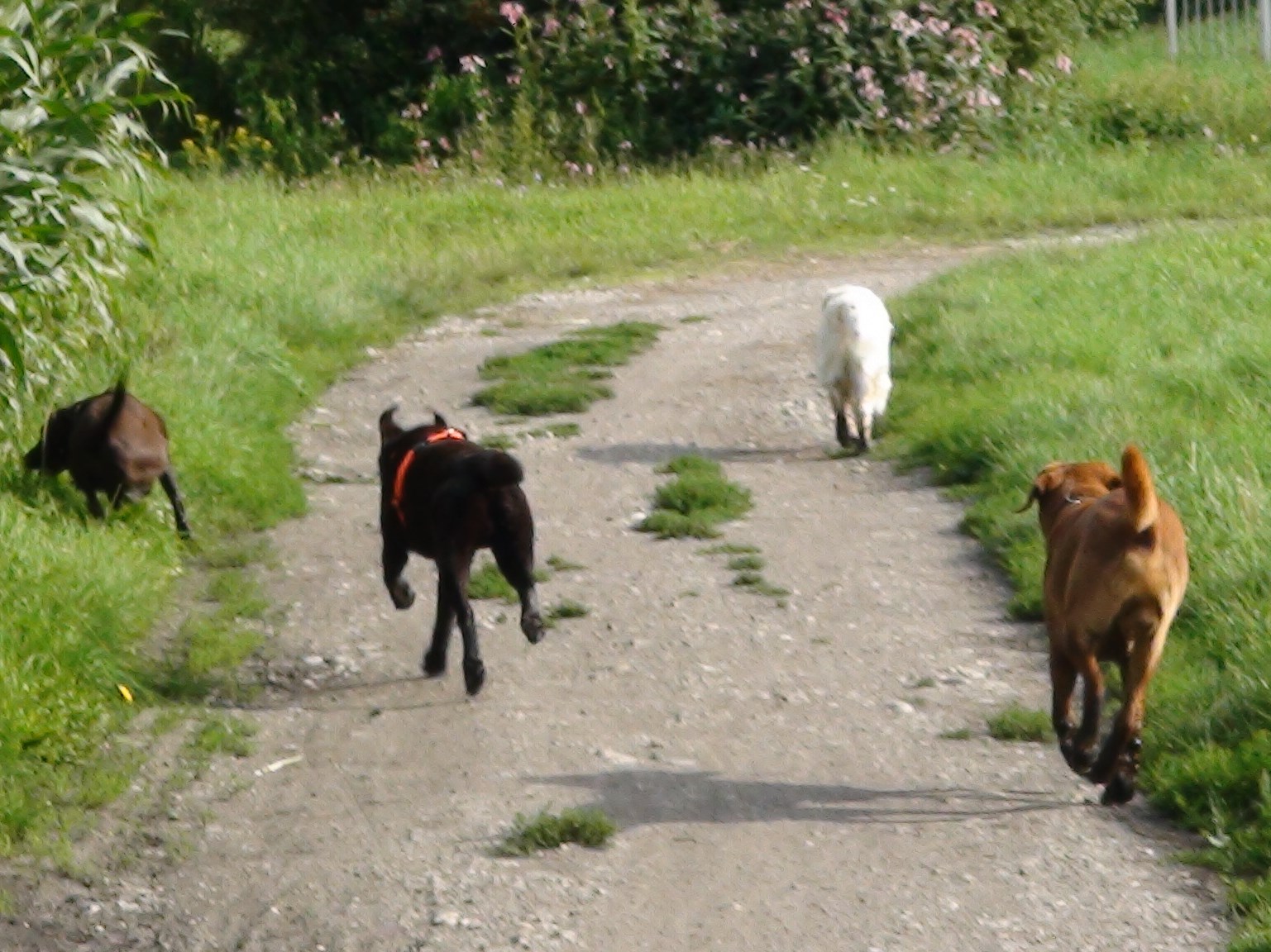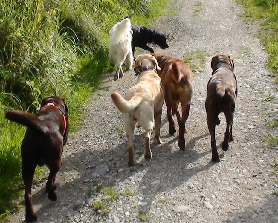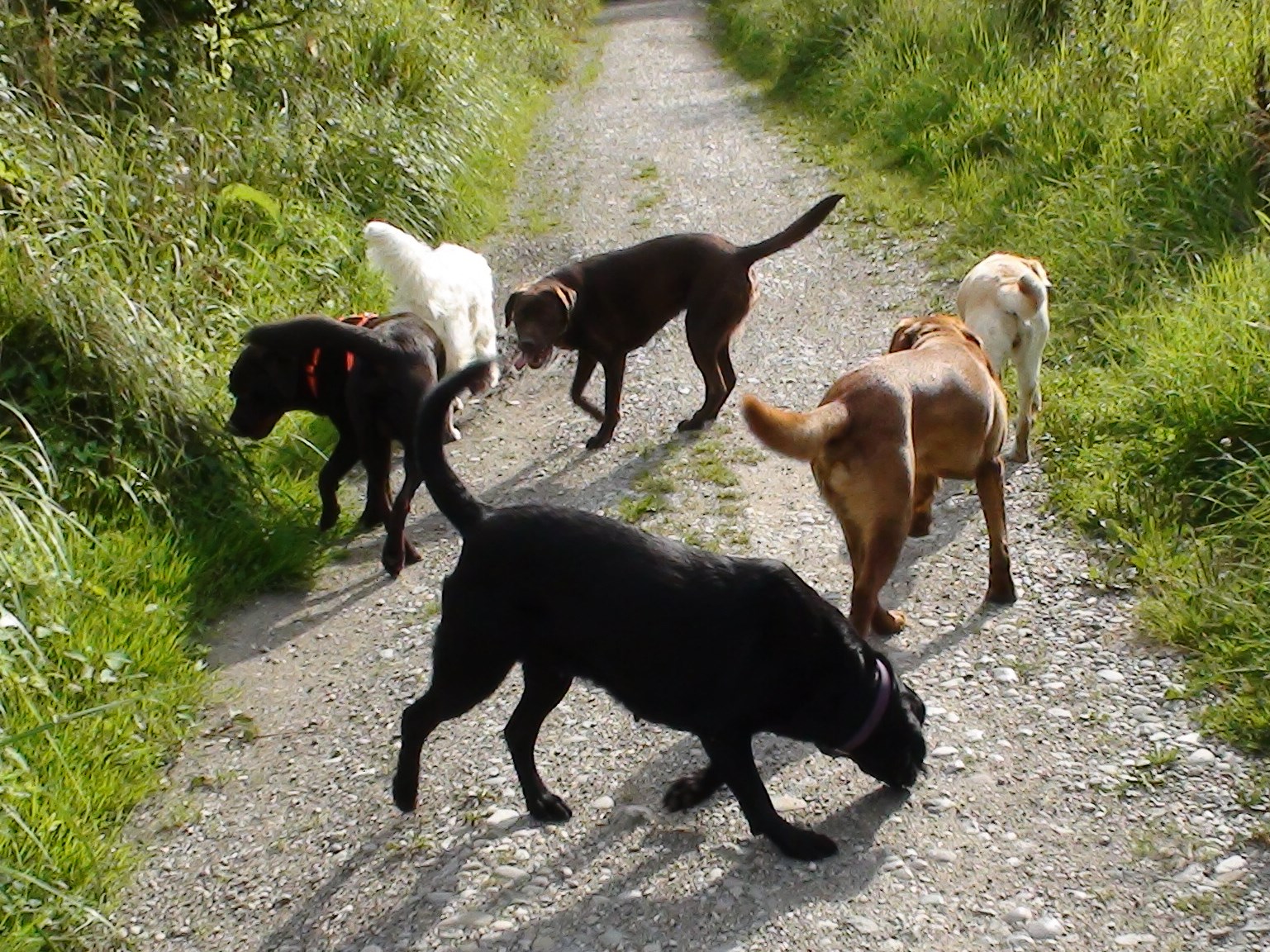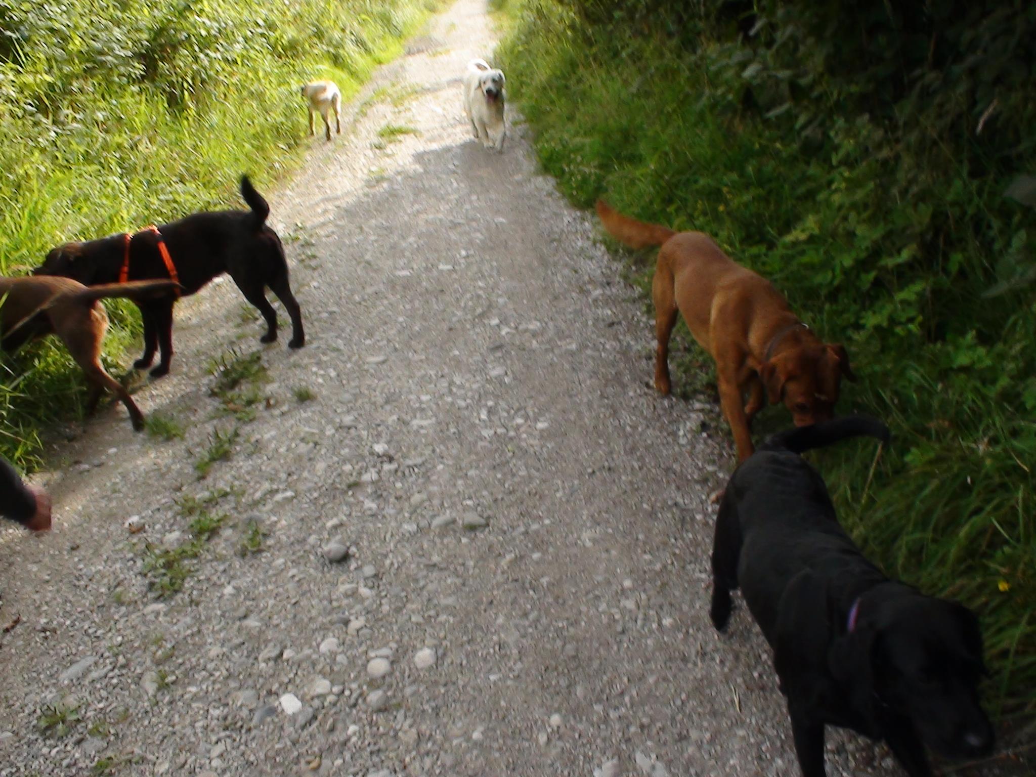 Dieser gemeinsame Spaziergang wird 1 x pro Woche angeboten, damit die Hunde die Möglichkeit haben, ausgelassen miteinander zu kommunizieren und zu spielen.